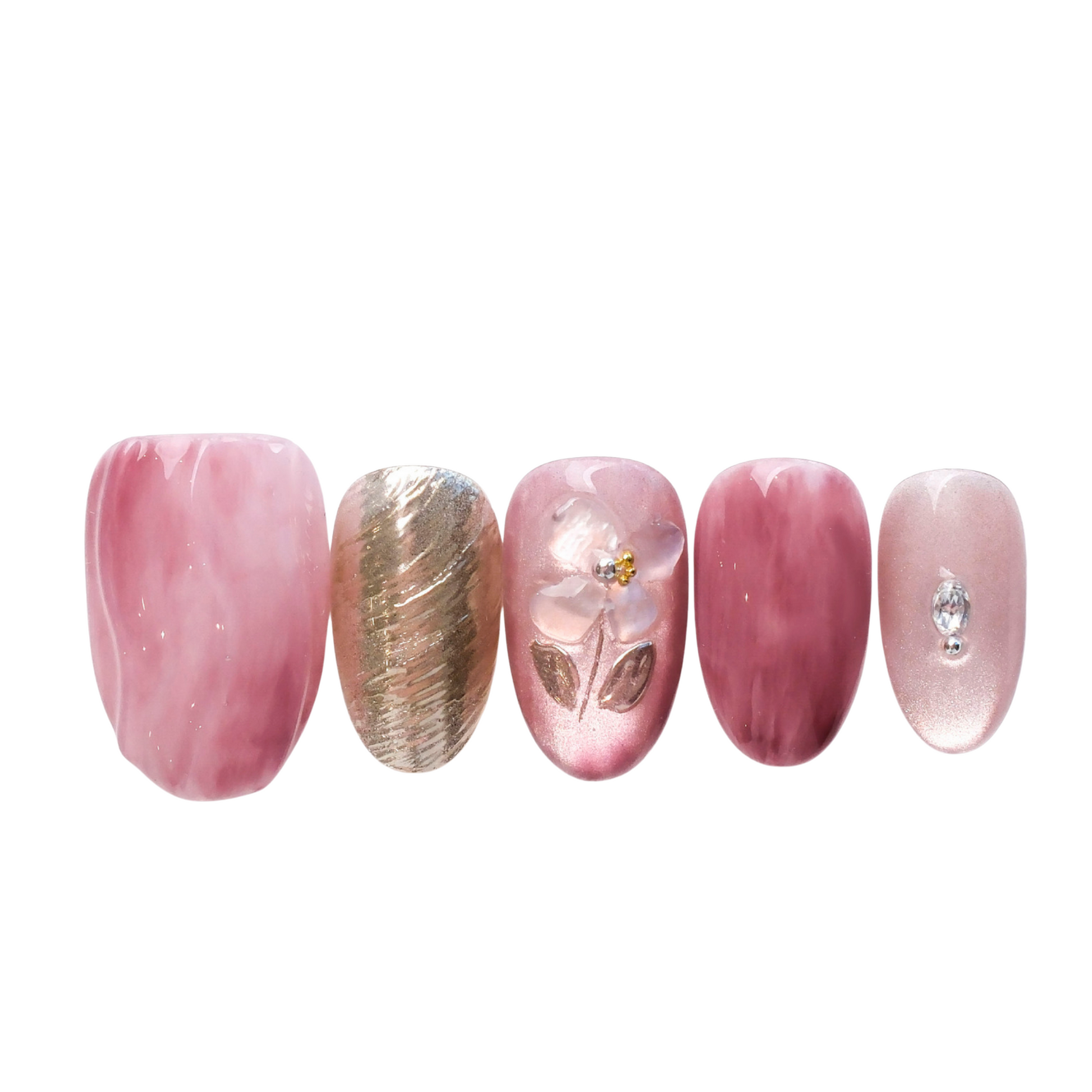 Where dawn’s first blush meets the shimmer of spring. Rose-pink swirls melt into molten gold, while a single blossom blooms in delicate relief—its petals kissed with light, its leaves brushed in bronze. A whisper of pearl and crystal catches the eye, soft yet impossible to ignore. Wear them for garden parties, moonlit dates, or simply to keep a little poetry on your fingertips. 🌸✨